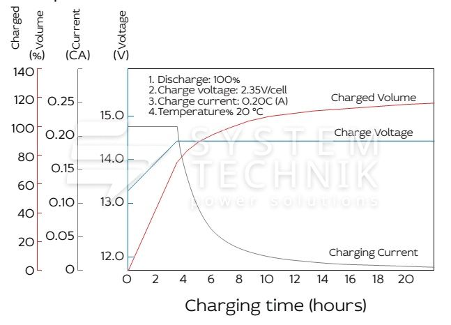 - Рекомендуемое напряжение заряда в циклическом режиме для 12В батареи: 13,5В-14,1В при 25ºС;