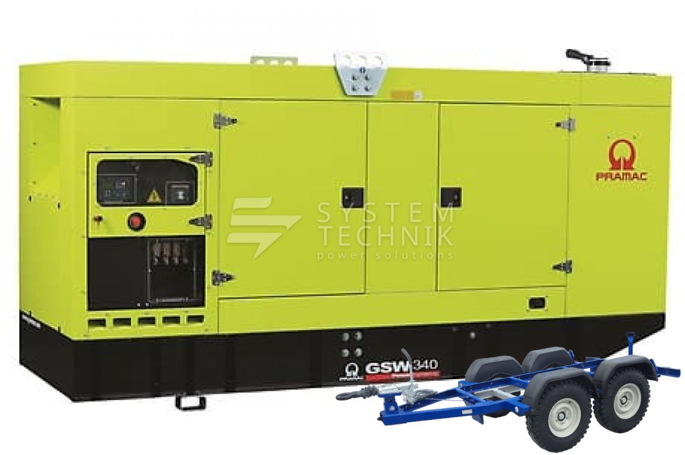 - Дизельный генератор Pramac GSW 340 P 380V В кожухе на прицепе